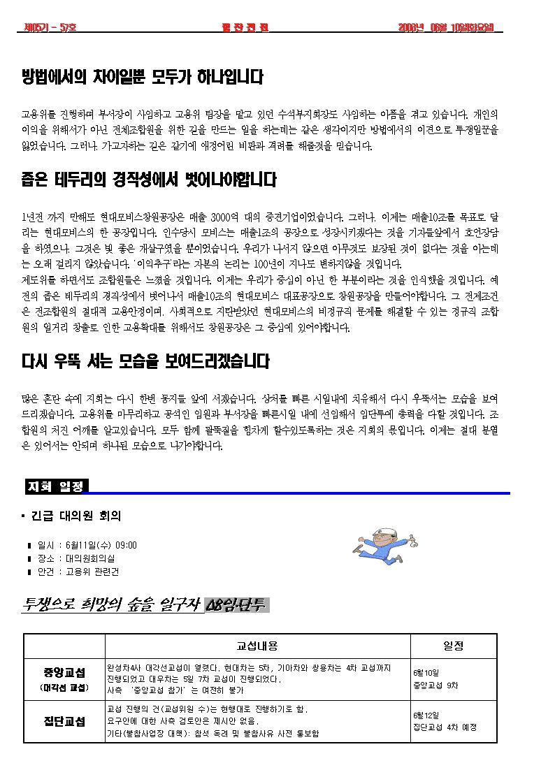 고용위를 진행하며 부서장이 사임하고 고용위 팀장을 맡고 있던 수석부지회장도 사임하는 아픔을 겪고 있습니다. 개인의 이익을 위해서가 아닌 전체조합원을 위한 길을 만드는 일을 하는데는 같은 생각이지만 방법에서의 이견으로 투쟁일꾼을 잃었습니다. 그러나, 가고자하는 길은 같기에 애정어린 비판과 격려를 해줄것을 믿습니다.