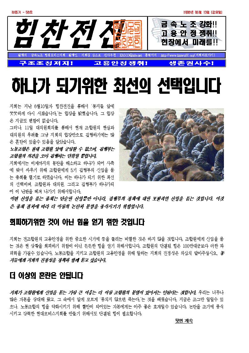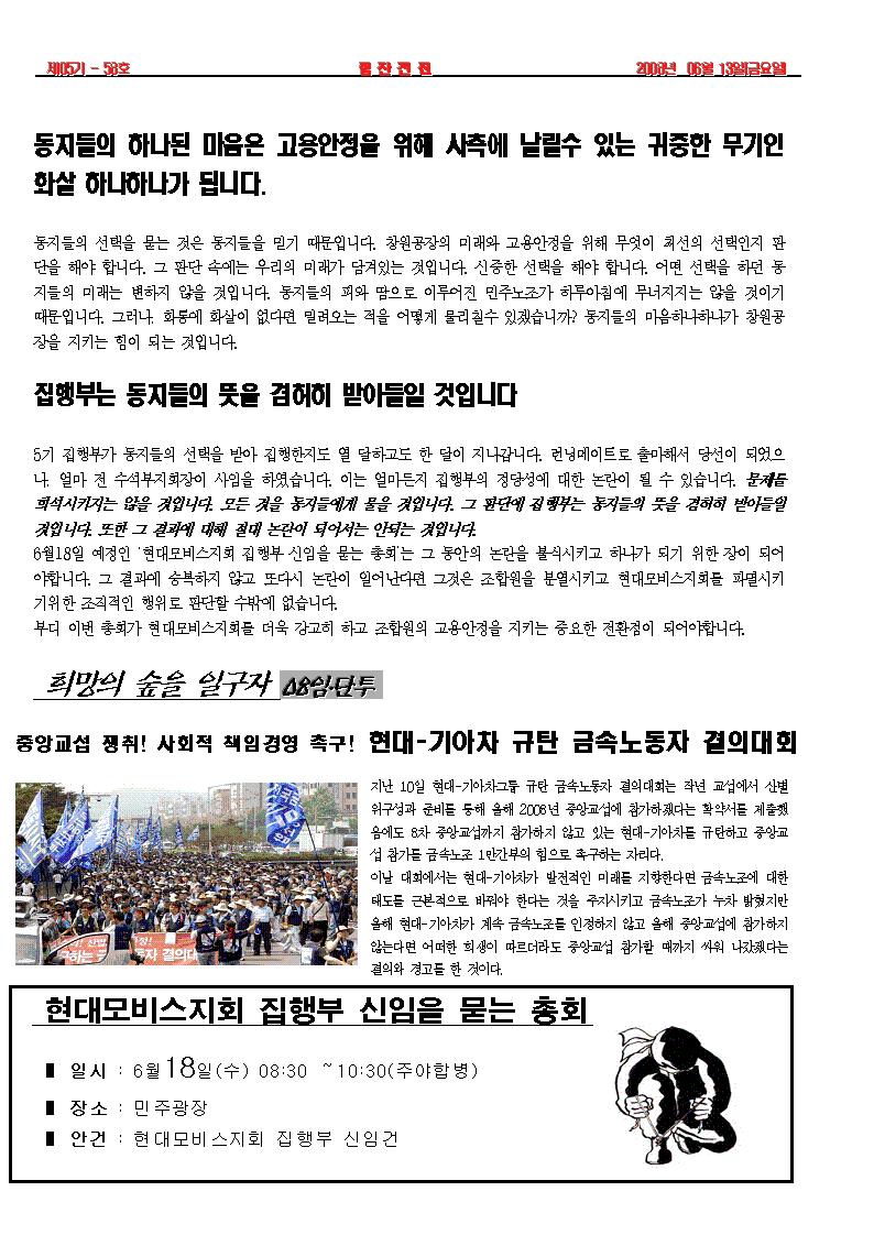 6월18일 예정인 ‘현대모비스지회 집행부 신임을 묻는 총회’는 그 동안의 논란을 불식시키고 하나가 되기 위한 장이 되어야합니다. 그 결과에 승복하지 않고 또다시 논란이 일어난다면 그것은 조합원을 분열시키고 현대모비스지회를 파멸시키기위한 조직적인 행위로 판단할 수밖에 없습니다.