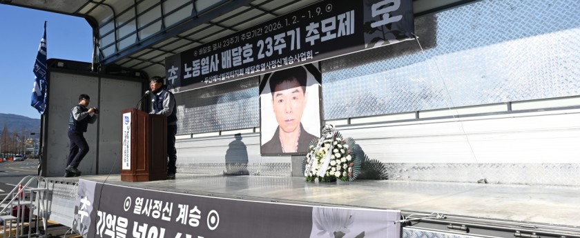 금속노조 경남지부가 1월 9일 12시 두산에너빌리티 정문 앞에서 ‘배달호 노동열사 23주기 추모제’를 진행했다. 배달호 열사는 손배가압류 문제와 IMF 이후 신자유주의 도입 과정에서의 폭력적인 구조조정과 노조탄압 문제를 세상에 알려며 2003년 1월 9일 분신했다.   김은형 민주노총 경남본부장은 추모사에서 "배달호 열사 투쟁은 손배가압류 문제를 전국적으로 제기한 최초의 거대한 투쟁이자 민주노조를 사수하고 했던 투쟁이며, 노조법 개정의 역사의 뿌리이다. 배달호 열사투쟁과 조선소 사내하청 동지들의 투쟁은 경남지역 투쟁이 20년 역사 속에서 노조법 2-3조 개정를 만들어 내는데 큰 역할을 했다"라며 "열사의 정신을 계승하여 2026년 원청교섭 쟁취, 모든 노동자의 노동‧정치기본권 쟁취, 내란‧외환세력 청산, 노동자‧민중을 위한 사회대개혁 투쟁에 선봉에 서겠다"라고 다짐했다.   조경식 금속노조 두산에너빌리티지회장은 "배달의 열사는 누구보다도 둥지들을 아끼고 노동조합을 사랑했다. 그랬던 그였기에 누구보다도 그 당시 가슴 아파했을 것이다"라며 "그가 목숨을 던지면서까지 지키고자 했던 노동조합, 동지들이다. 우리는 결코 잊지 말아야 한다"라고 말했다. 김형수 금속노조 부위원장은 "배달호 열사는 과거 투쟁했던 노동 선배가 아니라 제 곁에서 늘 저를 지키고 저를 붙잡아주는 코삐 같은 존재였다"라며 "힘들 때마다 저는 배달호 열사의 사진을 보며 또 다짐하고 또 다짐했었다. 열사의 염원을 현실로 만들기 위해 한 걸음 한 걸음 동지들과 걸어가고 있다"라고 말했다.   김 부위원장은 "오늘 이 순간에도 열사는 저의 마음 속에, 그리고 여기 앉아 있는 우리 모두의 마음속에 함께 계신 것 같다. 올해 어느 때보다 결의찬 투쟁이 필요한 시기“라고 목소리를 높였다.   강웅표 부울경노동역사관추진위원회 추진위원은 "지난 5일 열사 묘소에 갔다 오면서 '실천하지 않으면 어떻게 되겠는가?'라는 생각을 했다"라며 "배달호 열사의 정신을 마음 속에 새기면서 정말 실천하는 우리 멋진 노동자들이 되었으면 한다"라고 말했다.